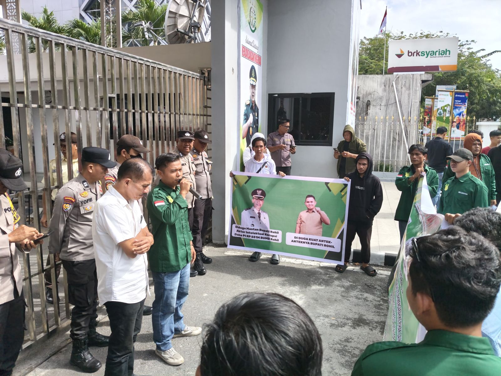Pekanbaru -- Puluhan Massa dari Gerakan Mahasiswa dan Kepemudaan Peduli Riau (GMPR) menggelar aksi demo di Kejaksaan Tingggi Pekanbaru. Senin (10/11), Mereka mendesak Kejaksaan Tinggi segera memeriksa mantan Bupati Rokan Hilir, Afrizal Sintong, dan oknum pengacara PT SPRH Zulkifli (Z) yang diduga terlibat dalam kasus dugaan penyelewengan dana Participating Interest (PI) sebesar Rp 551 Miliar.