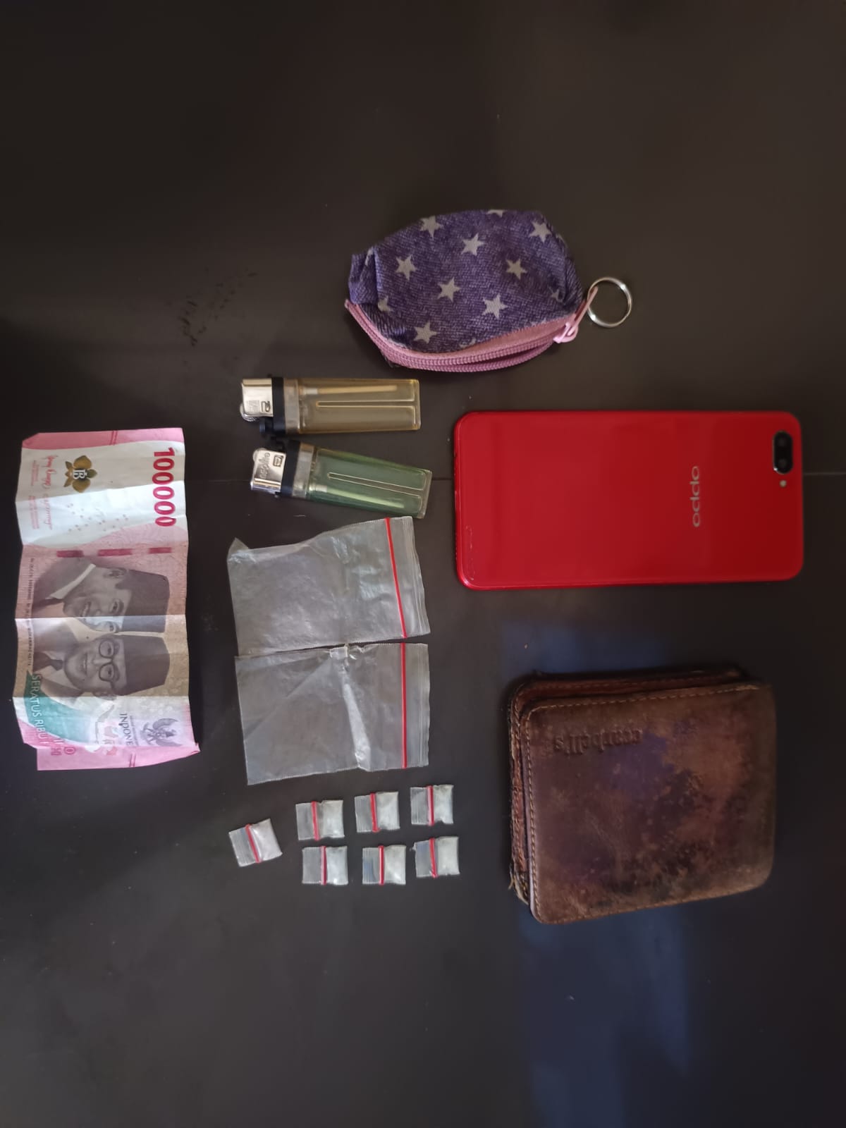 Saat melakukan pemeriksaan terhadap seorang pria pengendara motor Honda Supra X hitam yang berprilaku mencurigakan, petugas menemukan 7 paket kecil kristal putih (sabu) yang disimpan dalam dompet pelaku.