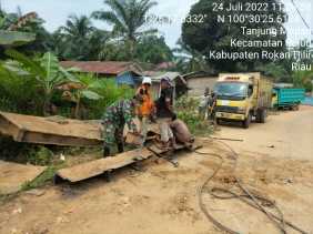Komsos Bersama Warga dan Ormas, Babinsa Koramil 02/TP Kembali Goro Perbaiki Jembatan