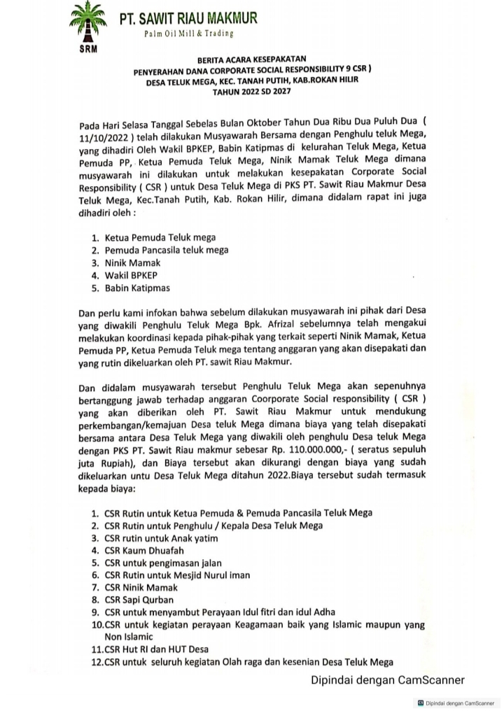 Rohil – Terkait santernya pemberitaan dugaan penyelewengan dana Corporate Social Responsibility (CSR) perusahaan perkebunan di Desa Teluk Mega, Kecamatan Tanah Putih Kabupaten Rokan Hilir kini menuai sorotan publik. Dana fantastis yang diperkirakan mencapai Rp110 juta per tiga tahun diperuntukkan tak tepat sasaran .