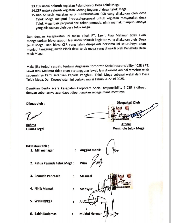 Sementara Pihak PT SRM sendiri, melalui klausul dalam berita acara tersebut, tidak mau menanggung risiko hukum pengelolaan dana kepada pihak desa. Meski secara prosedural perusahaan telah mengucurkan dana, penyerahan pengelolaan sepenuhnya kepada Penghulu dan perangkatnya.