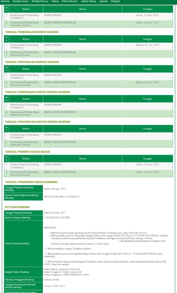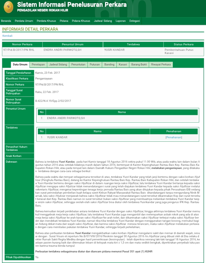 Sebagai informasi, Mahkamah Agung menolak kasasi YK dan menguatkan Putusan Banding PT Pekanbaru Nomor 176/PID.B/2017/PT PBR yang memperbaiki putusan awal PN Rohil Nomor 97/Pid.B/2017/PN-Rhl dari 3 bulan menjadi 1 tahun penjara setelah Yusri terbukti melakukan tindak pidana penganiayaan yang melanggar Pasal 351 ayat (1) KUHP. Isi Putusan tercatat secara terbuka di Laman Sistem Informasi Peradilan Pengadilan Negeri (SIPP) PN Rohil.