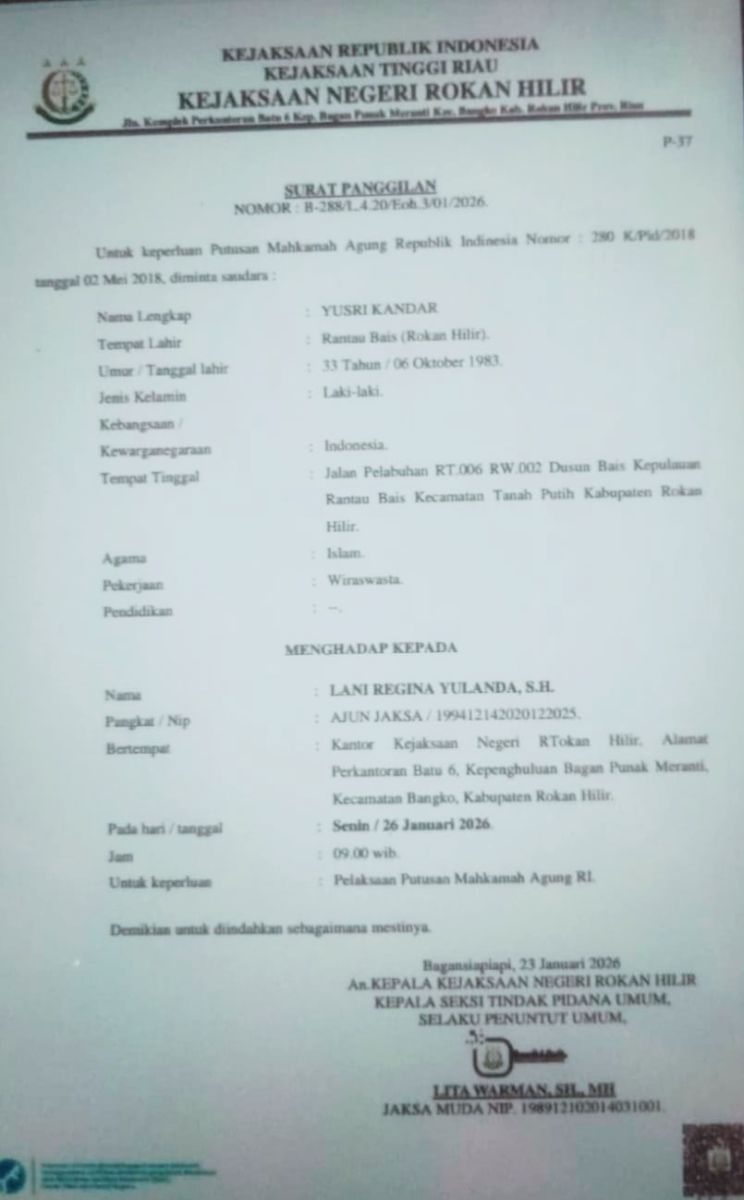 Dalam keterangan kepada awak media pada Sabtu (14/2/2026), Hariandi menyoroti kelambanan pelaksanaan eksekusi selama delapan tahun lamanya, bahkan setelah proses baru saja digerakkan pada 23 Januari 2026 lalu dengan keluarnya surat panggilan pertama dari Kejari Rohil.