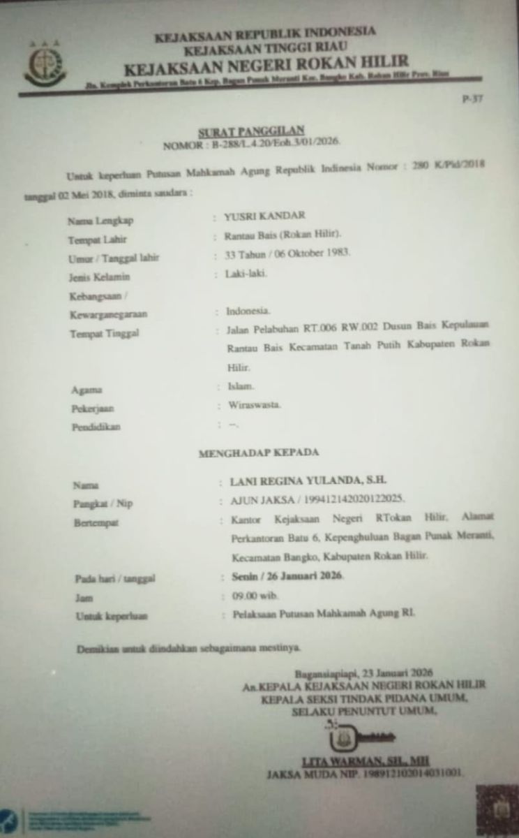 Rohil – Sebuah kasus yang mengundang pertanyaan besar terkait integritas sistem penegakan hukum di Kabupaten Rokan Hilir (Rohil) kembali diperbincangkan. Vonis penjara 1 tahun yang dijatuhkan Pengadilan Tinggi Pekanbaru dan dikuatkan Mahkamah Agung RI terhadap Yusri Kandar jabatan Direktur Utama PT Sarana Pembangunan Rokan Hilir (SPRH) Perseroda telah berusia delapan tahun lamanya namun hingga kini belum pernah dieksekusi sama sekali.