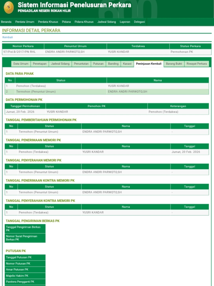 Sementara awak media mendapati informasi dilaman di Laman Sistem Informasi Peradilan Pengadilan Negeri (SIPP) PN Rohil Nomor perkara : 97/Pid.B/2017/PN RHL perihal Permohonan Peninjauan Kembali (PK) Yusri Kandar pada Jumat, 20 Februari 2026.