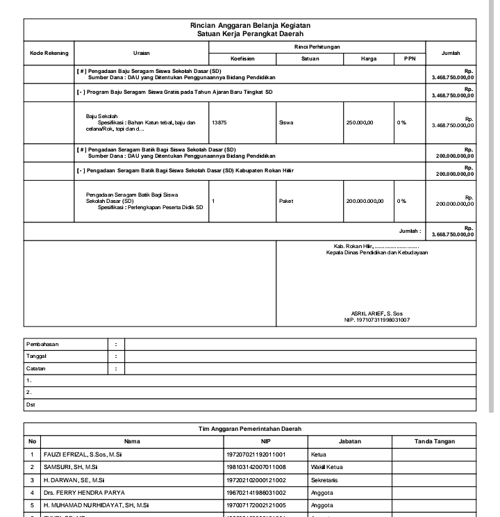 Sementara itu untuk Baju Seragam tingkat SD, alokasi anggaran mencapai Rp3.668.750.000,00 untuk 13.875 siswa dengan spesifikasi bahan katun tebal (baju, celana/rok, topi) dengan harga satuan Rp250.000,00 per siswa ditambah Pengadaan Seragam Batik: Rp200.000.000,00 untuk seluruh siswa SD di Kabupaten Rohil.